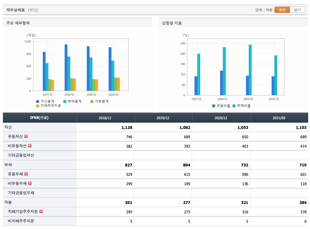 자산은 2018년 1128억원, 2019년 1082억원, 2020년 1053억원, 2021년 1,2,3분기 1103억원으로 증가 하였습니다.