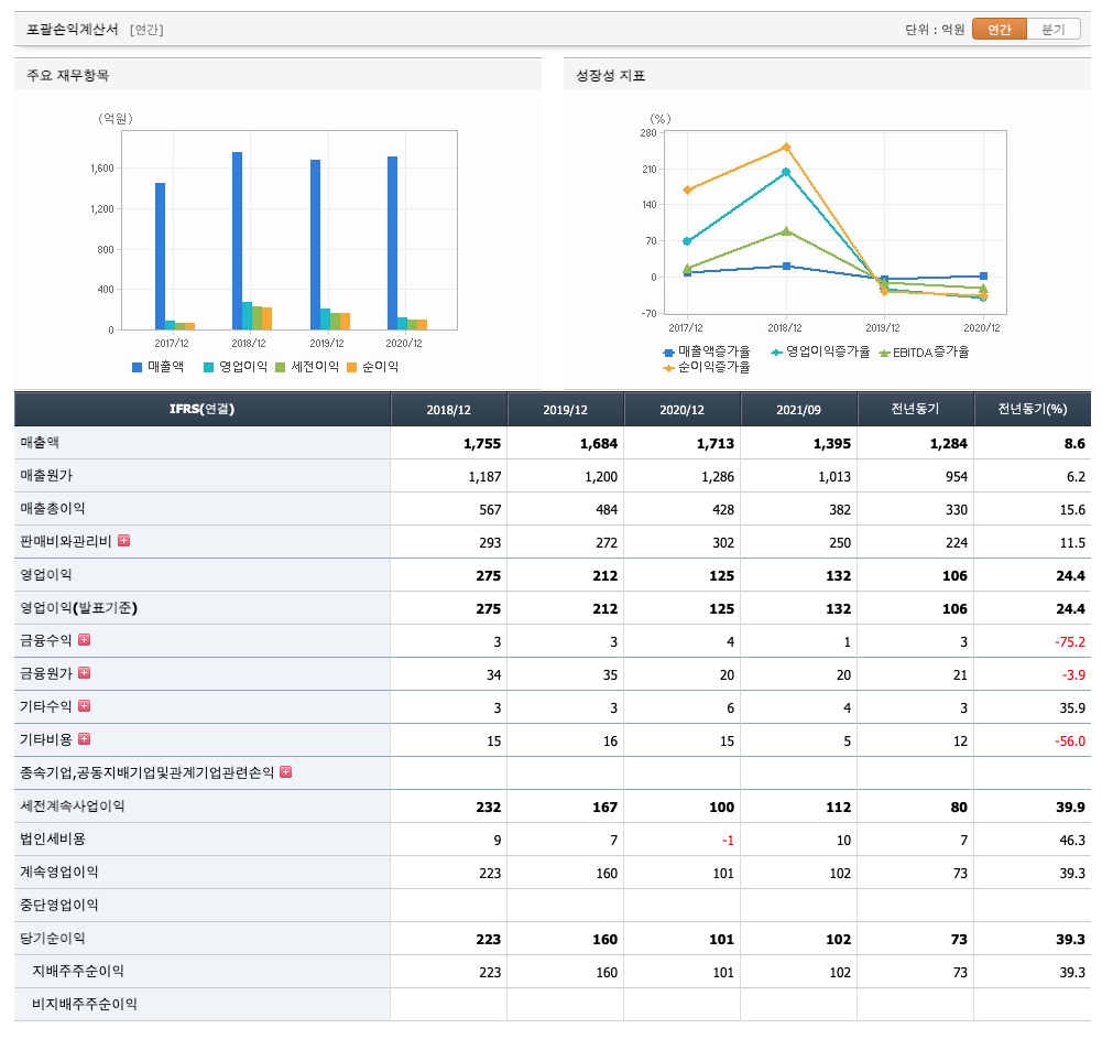 매출액 : 2018년 1755억원, 2019년 1684억원, 2020년 1713억원, 2021년 1,2,3분기 1395억원으로 전년동기대비 증가하였습니다. 2021년 3분기는 전년동기대비 8.6% 증가하였습니다. 2020년 분기별로 보면 4분기 429억원, 2021년 1분기 464억원, 2분기 440억원, 3분기 491억원입니다.