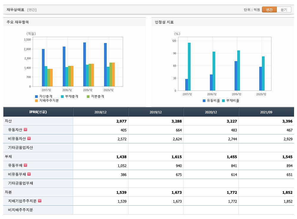 자산은 2018년 2977억원, 2019년 3288억원, 2020년 3227억원, 2021년 1,2,3분기 3396억원으로 증가 하였습니다.