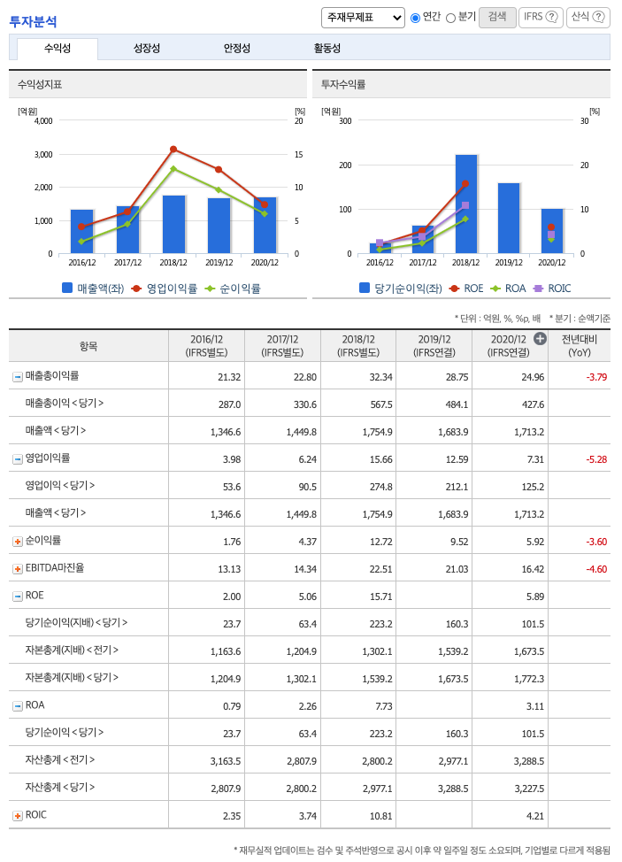 ROA(Return On Assets, 총자산순이익율, 경영자의 관점) : 2016년 약 0.79%, 2017년 약 2%, 2018년 약 7%, 2020년 약 3%이고, 총자산이익율은 이상율(10%)보다 낮습니다.