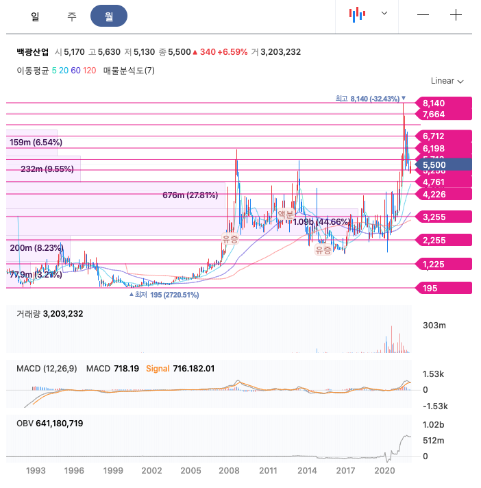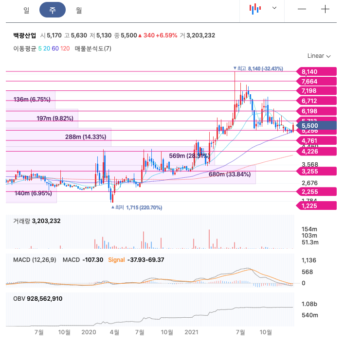 백광산업의 주가는 21년 6월 급등하여 최고 8,140원을 찍고 조정을 받았습니다.