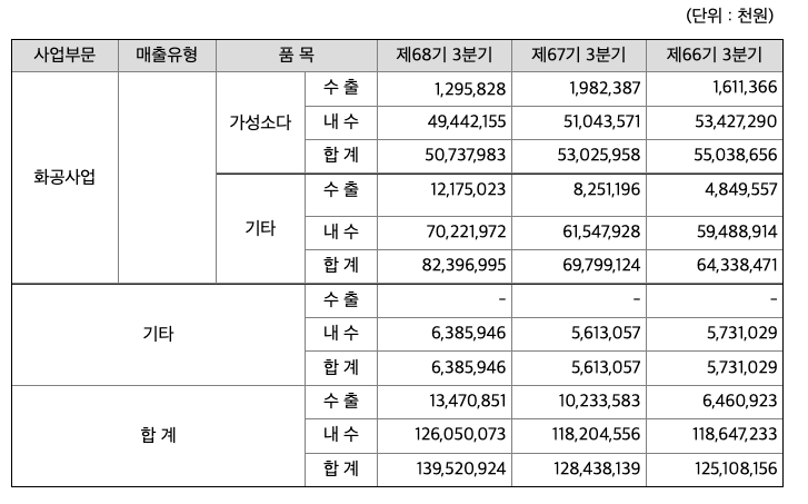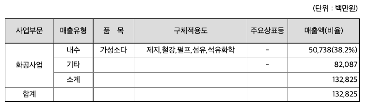 당사는 염화나트륨을 원료로 하여 알칼리와 염소를 생산하는 무기화학제품 제조업체로서 국내에서는 롯데정밀화학, 한화솔루션, LG화학, OCI 등이 당사와 동일제품을 생산 판매하고 있습니다. 또한 사업다각화의 목적으로 2019년부터 음성공장을 신설하여 아산화질소(N2O)를 생산하여 판매하고 있으며, 군산공장에 반도체용 특수가스인 고순도염소와 염화수소의 생산설비를 도입하여 시장을 개척하고 있습니다.