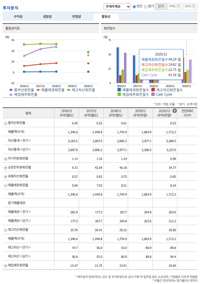 재고자산회전율(높을 수록 좋습니다) : 2018년 약 80억원, 2019년 약 89억원, 2020년 약 94억원이고, 회전율은 2018년 약 26%, 2020년 약 18%로 안정적입니다.