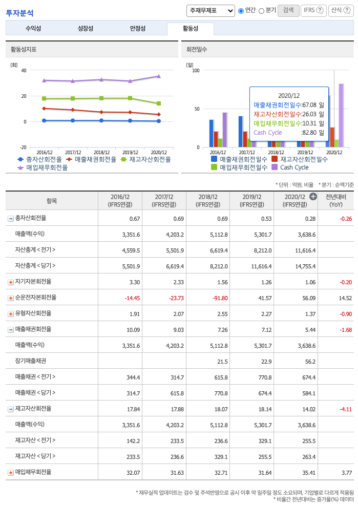 **매출채권회전일수(=돈을 받는 순환일 수, 낮을 수록 좋습니다) 약 67일, 재고자산회전일수(=재고자산 빠지는 일수, 높을 수록 좋습니다) 약 26일, 매입채무회전일수(=돈을 늦게 줘도 되는 일 수, 높을 수록 좋습니다) 약 10일이고, Cash Cycle(현금회전율, 낮을 수록 좋습니다) 약 82일로 현금운영입니다.