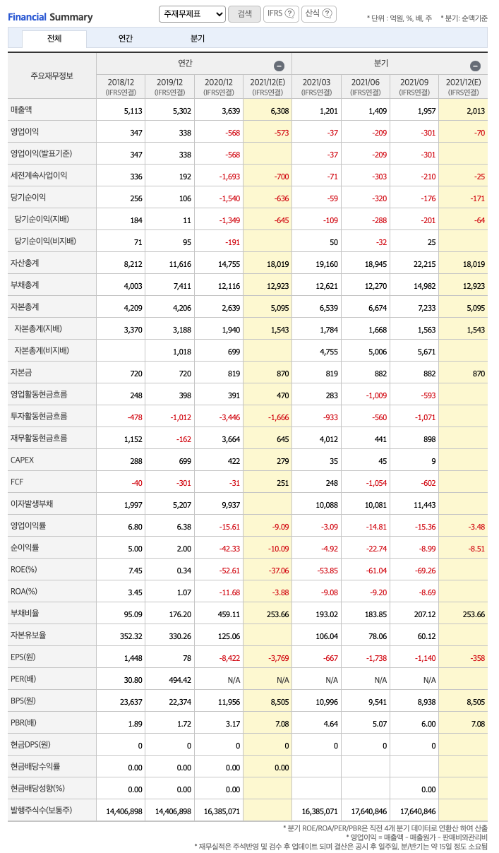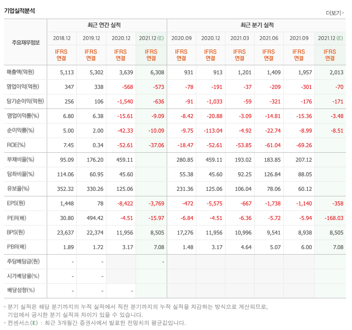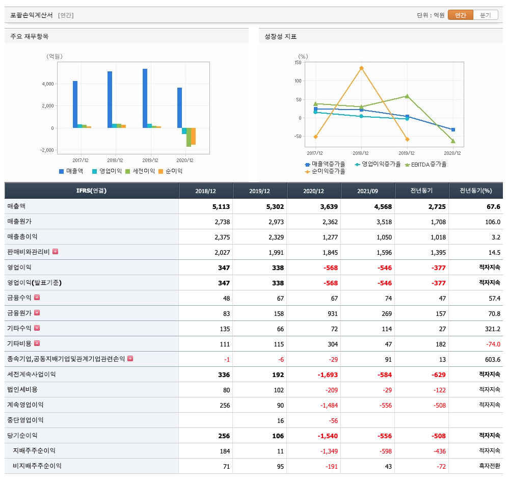영업이익 : 2018년 347억원, 2019년 338억원, 2020년 -568억원, 2021년 1,2,3분기 -549억원으로 전년동기대비 적자지속하였습니다. 2020년 분기별로 보면 4분기 -191억원, 2021년 1분기 -37억원, 2분기 -209억원, 3분기 -301억원입니다.