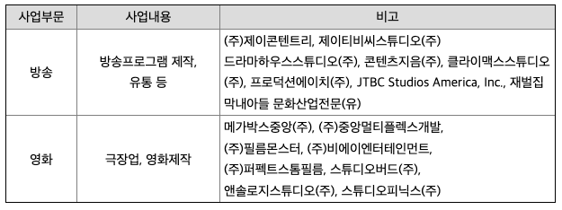 종합 미디어기업, 드라마 및 영화 IP투자, 영화관 운영, 방송프로그램 제작 및 유통