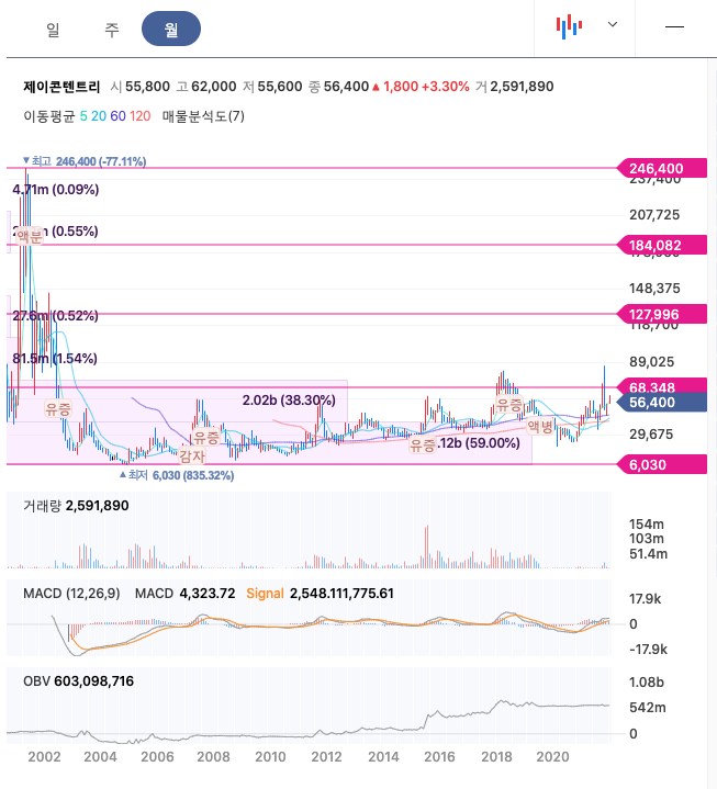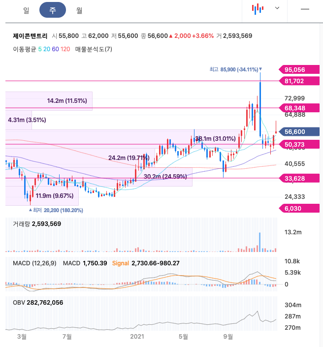 제이콘텐트리의 주가는 21년 8월 반등하여 21년 11월 최고 85,900원을 찍고 조정을 받았습니다.