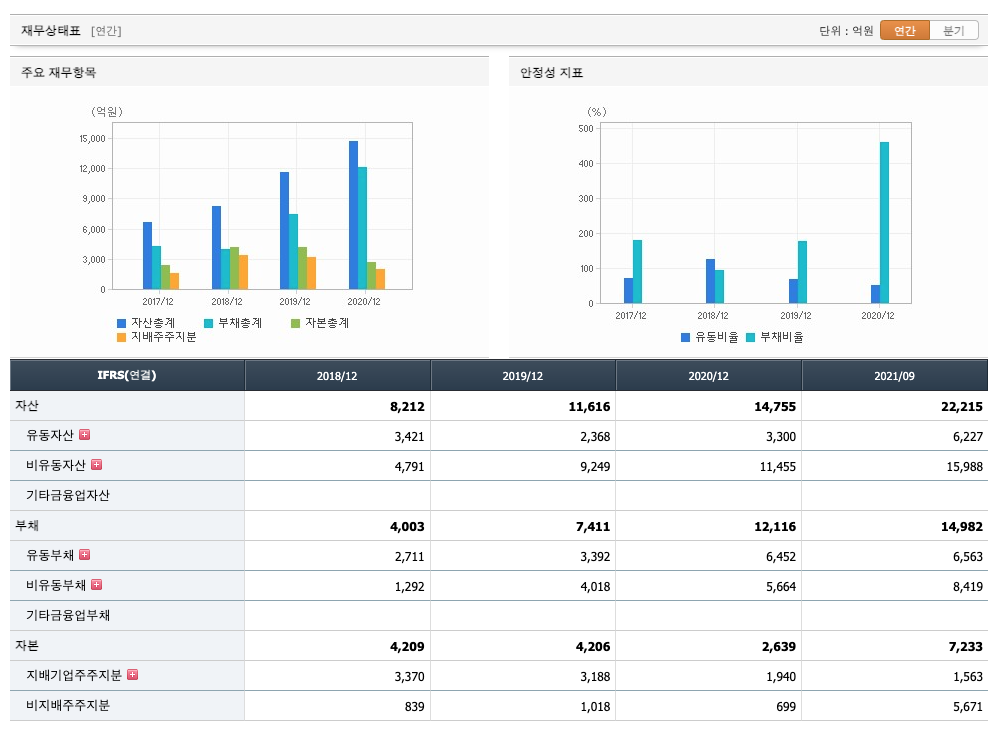 부채는 2018년 4003억원, 2019년 7411억원, 2020년 12,116억원, 2021년 1,2,3분기 14,982억원으로 증가 하였습니다.
