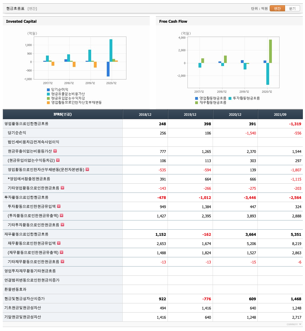 투자활동 현금흐름 : 2018년 -478억원, 2019년 -1012억원, 2020년 -3446억원, 2021년 1,2,3분기 -2564억원으로 투자활동 현금흐름이 원활합니다.