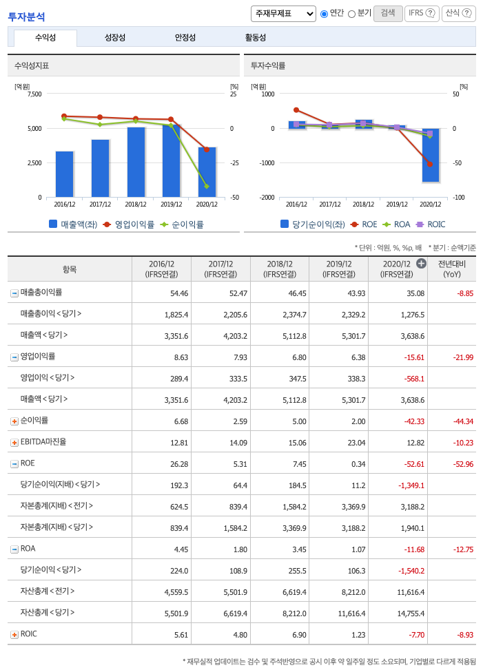 ROE(Return On Equity, 자기자본순이익율, 주주의 관점) : 2016년 약 26%, 2017년 약 5%, 2018년 약 7%, 2019년 약 0.34%, 2020년 약 -52%이고, 자기자본순이익율은 이상율(10%)보다 낮습니다.