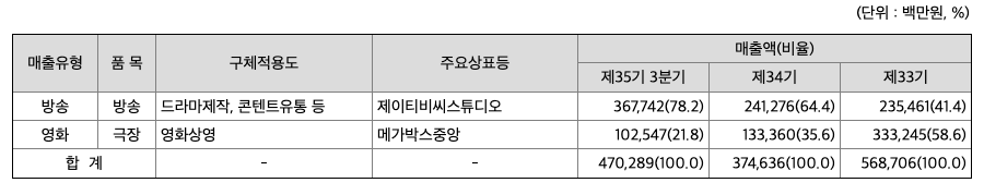 당사는 계열사관리 등 지주업과 영화 및 방송 콘텐트투자 사업을 영위하고 있습니다.또한, 종속회사를 통하여 극장 운영, 방송용 프로그램의 제작 및 유통 등을 영위하고있습니다. 현재, 당사가 수행중인 사업의 분류 및 사업에 대한 내용은 다음과 같습니다.
