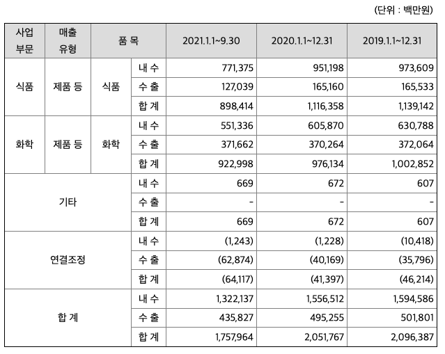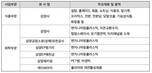 당사 및 연결대상 종속회사의 사업은 크게 식품부문, 화학부문으로 나뉩니다. 식품부문의 주요 제품으로는 설탕, 밀가루, 전분당, 유지 등이 있으며 화학부문의 주요 제품으로는 엔지니어링 플라스틱, PET 용기, 이온교환수지, 터치패널용 소재, 폴리머 등이 있습니다. 보고서 작성 기준일 현재 당사 및 한국채택국제회계기준의 도입에 따른 연결대상 종속회사인 삼양공정소료(상해)유한공사, 삼양EP헝가리, 삼양EP베트남, 삼양패키징, 케이씨아이가 영위하는 사업부문별 현황을 요약하면 아래와 같습니다.