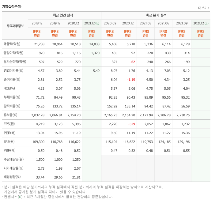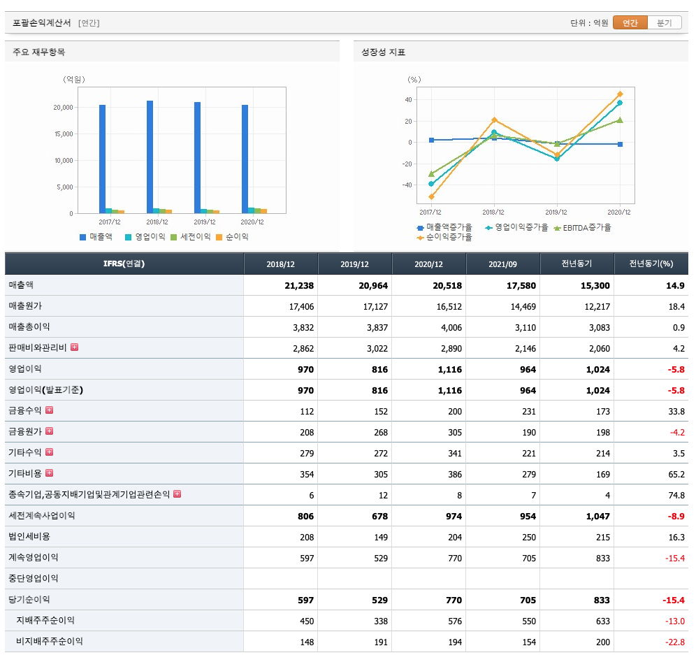 매출액 : 2018년 21,238억원, 2019년 20,964억원, 2020년 20,518억원, 2021년 1,2,3분기 17,580억원으로 전년동기대비 증가하였습니다. 2021년 3분기는 전년동기대비 14.9% 증가하였습니다. 2020년 분기별로 보면 4분기 5218억원, 2021년 1분기 5336억원, 2분기 6114억원, 3분기 6129억원입니다.