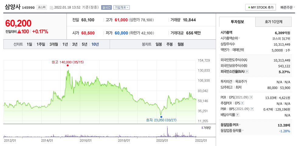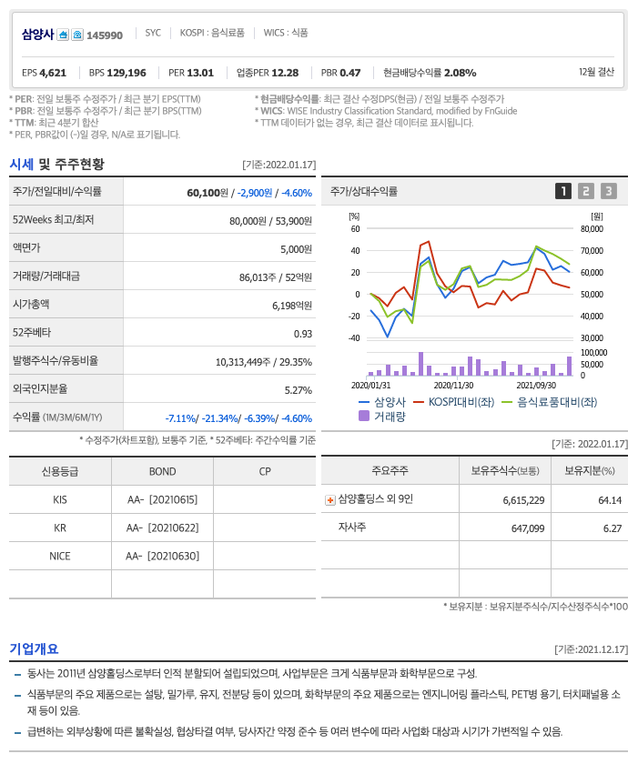 | 삼양사 | 60,000원 | 64,469원 | 64,153원 | 63,524원 |