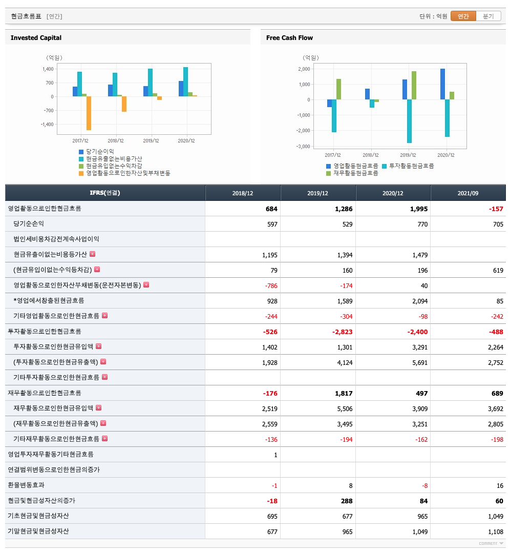 영업활동 현금흐름 : 2018년 684억원, 2019년 1286억원, 2020년 1995억원, 2021년 1,2,3분기 -157억원으로 2020년까지 영업활동 현금흐름이 원활합니다.