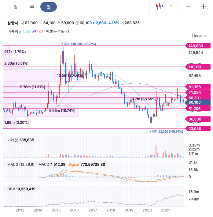 삼양사의 주가는 20년 7월 급등하여 보합상태였다가 21년 9월 최고 80,000원을 찍고 조정을 받았습니다.
