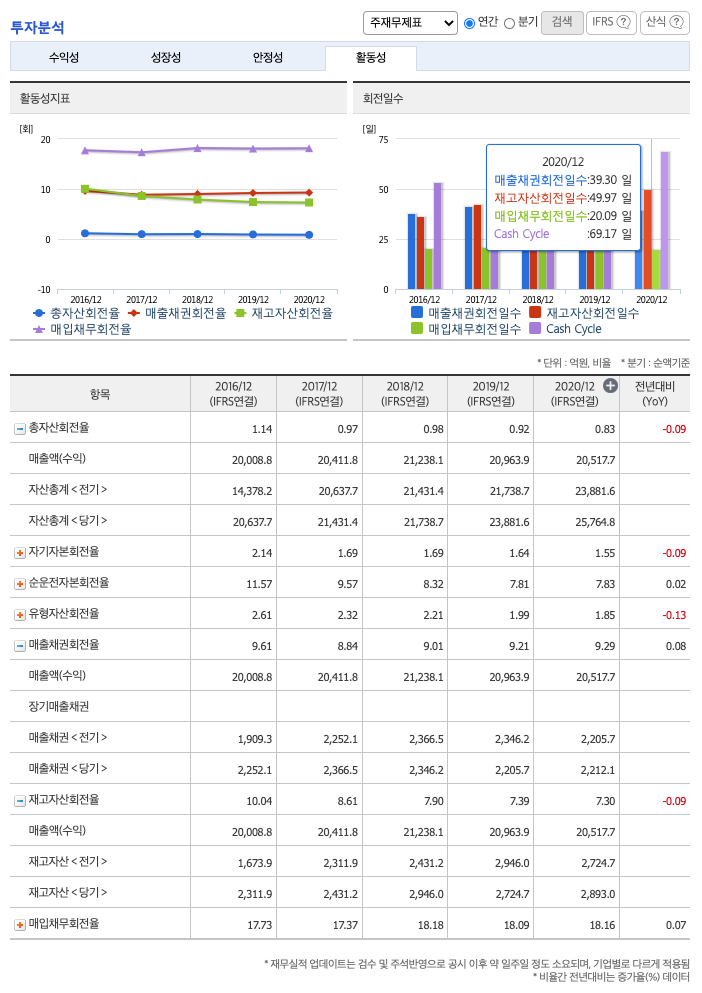 **매출채권회전일수(=돈을 받는 순환일 수, 낮을 수록 좋습니다) 약 39일, 재고자산회전일수(=재고자산 빠지는 일수, 높을 수록 좋습니다) 약 49일, 매입채무회전일수(=돈을 늦게 줘도 되는 일 수, 높을 수록 좋습니다) 약 20일이고, Cash Cycle(현금회전율, 낮을 수록 좋습니다) 약 69일로 현금운영입니다.