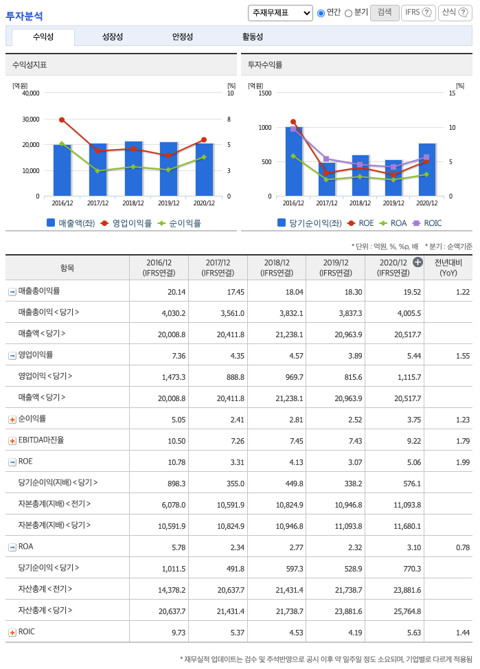 ROE(Return On Equity, 자기자본순이익율, 주주의 관점) : 2016년 약 10%, 2017년 약 3%, 2018년 약 4%, 2019년 약 3%, 2020년 약 5%이고, 자기자본순이익율은 이상율(10%)보다 낮습니다.