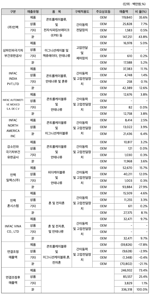 당사의 주요 매출품목은 액츄에이터류, 밸브류, 전자식파킹브레이크케이블, 콘트롤케이블류, 친환경차용 전력전자 PCB Assembly 등으로 다양한 거래처에 안정적으로제품을 공급하고 있습니다. 주요 거래처는 현대자동차, 기아자동차, 쌍용차 등 국내 완성업체는 물론이고, GM, BORGWARNER, AMK, VIBRACOUSTIC, BREMBO, MAZDA 등 해외 유수의 자동차 생산업체 및 부품업체에 액츄에이터 및 밸브류 등을 공급하고 있으며, 또한 세계의 자동차 부품업체와의 경쟁우위를 확보하기 위하여 끊임없이 연구개발과 GLOBAL SOURCING을 통한 원가절감에 노력을 기울이고 있으며, 철저한 고객위주의 정책을 펴고 있습니다.