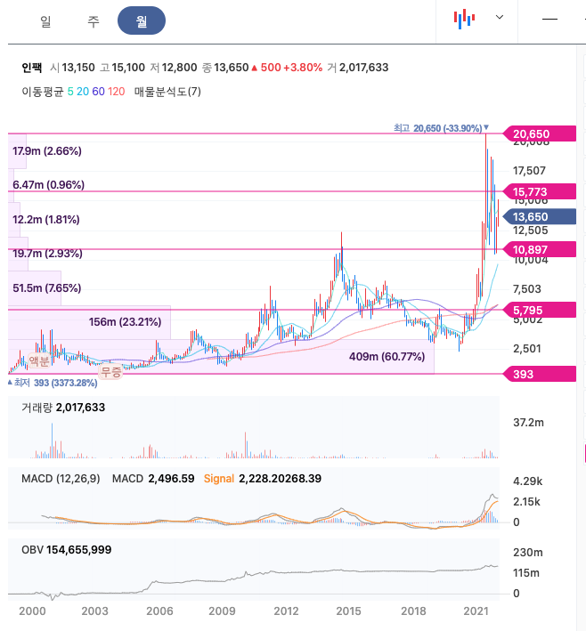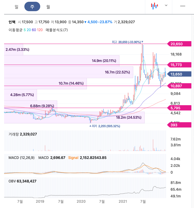 인팩의 주가는 21년 4월부터 반등하여 21년 6월 최고 20,650원을 찍고 조정을 받았습니다.