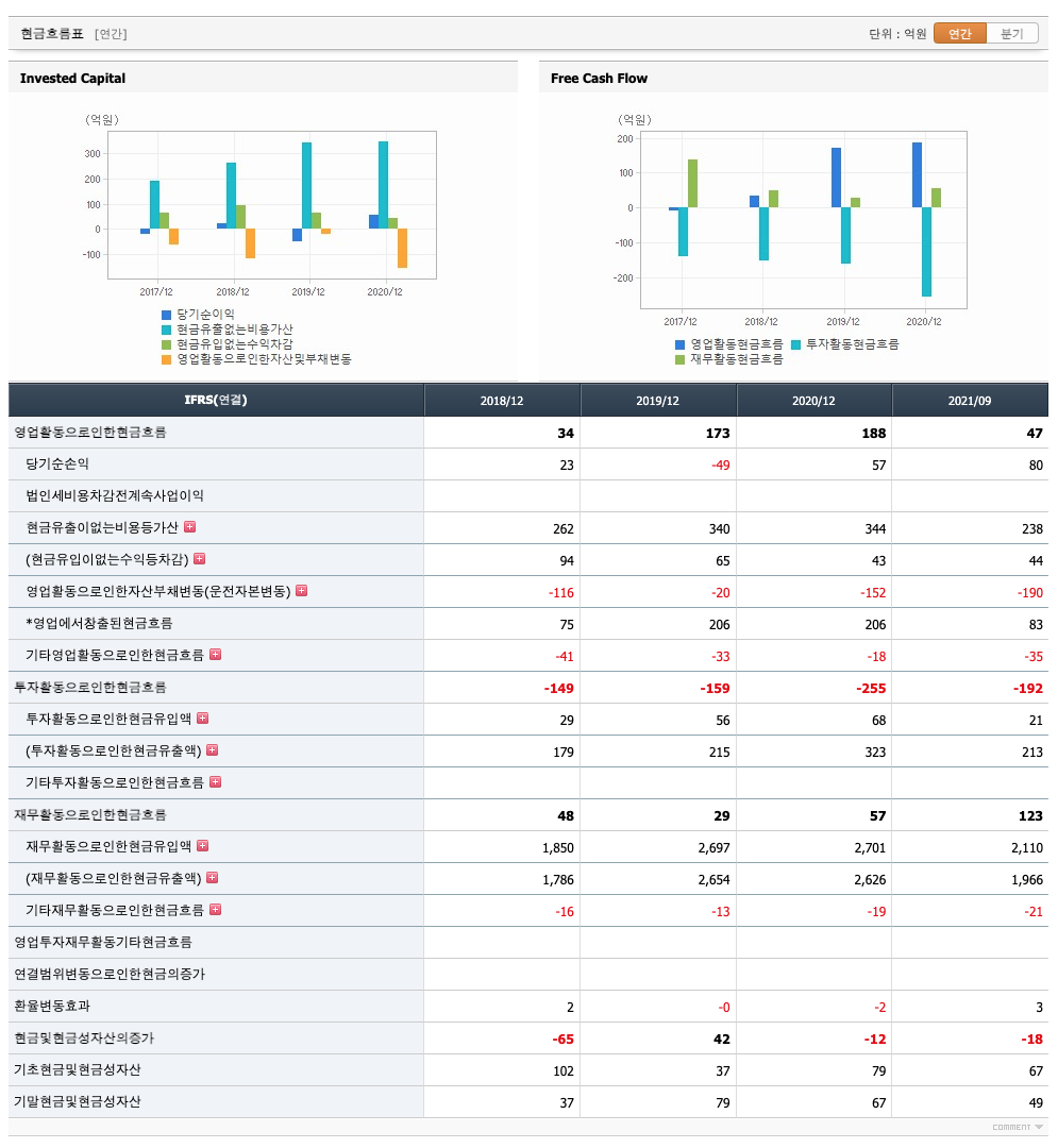 투자활동 현금흐름 : 2018년 -149억원, 2019년 -159억원, 2020년 -255억원, 2021년 1,2,3분기 -192억원으로 투자활동 현금흐름이 원활합니다.