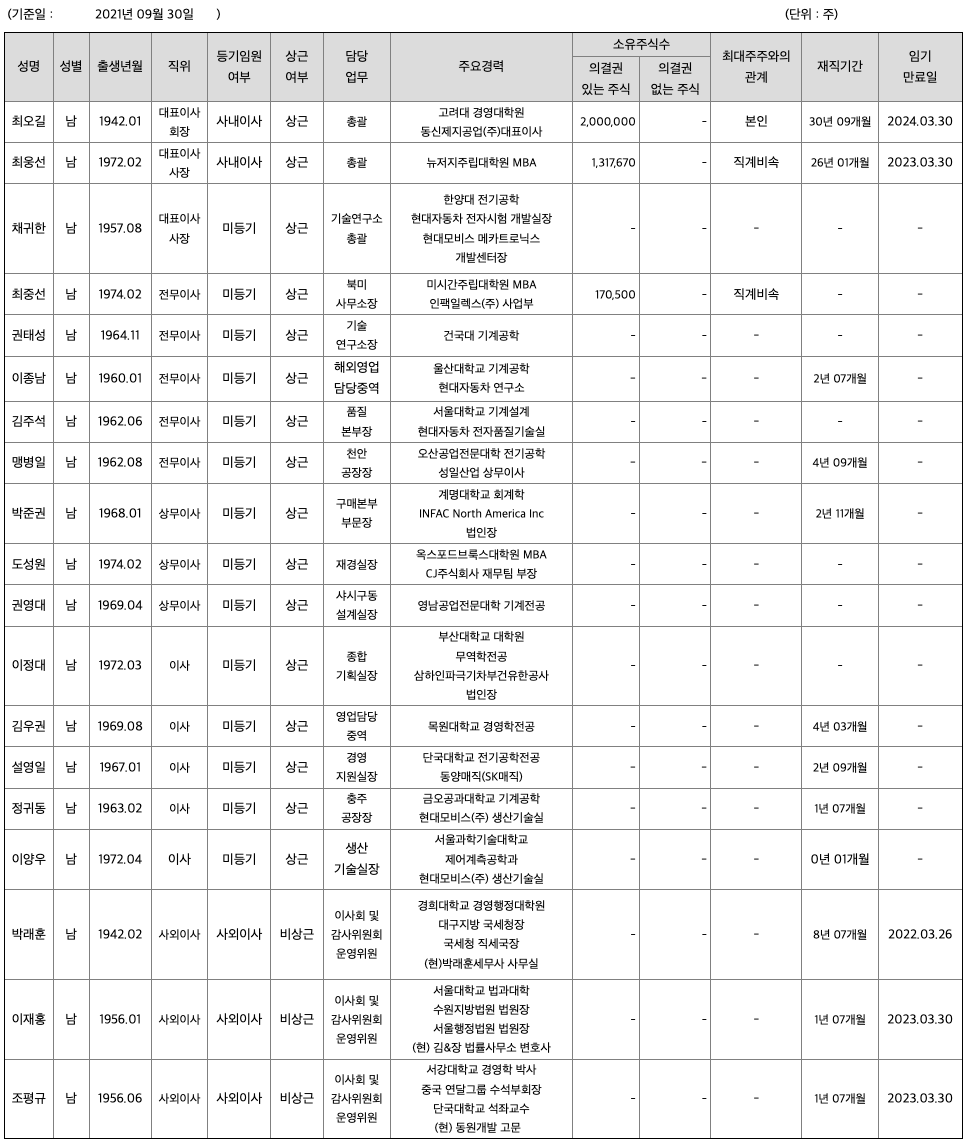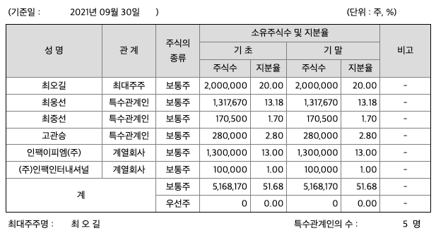 2021년 09월 30일 현재 당사의 최대주주인 최오길은 당사 발행주식총수의 20.00%를 보유하고 있습니다. 당분기보고서 작성 기준일 현재 당사의 최대주주 및 특수관계인이 소유한 지분은 발행주식총수의 51.68%입니다.
