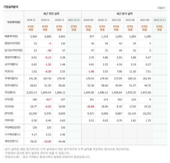 매출액 : 2018년 3504억원, 2019년 3608억원, 2020년 3842억원, 2021년 1,2,3분기 3363억원으로 전년동기대비 증가하였습니다. 2021년 3분기는 전년동기대비 28.2% 증가하였습니다. 2020년 분기별로 보면 4분기 1219억원, 2021년 1분기 1059억원, 2분기 1005억원, 3분기 1299억원입니다.