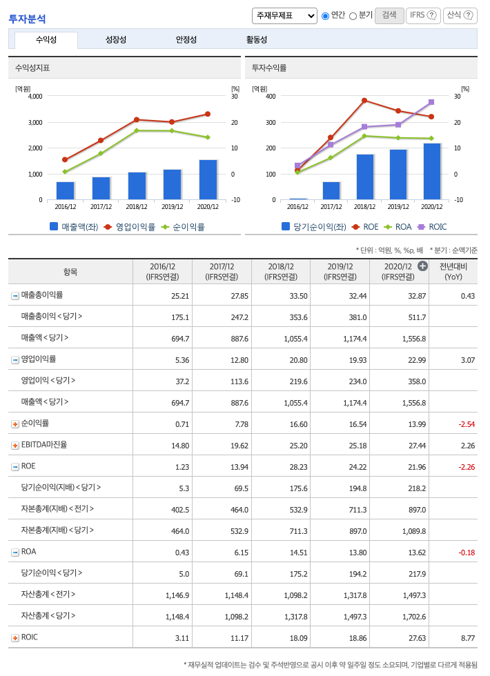 ROE(Return On Equity, 자기자본순이익율, 주주의 관점) : 2016년 약 1%, 2017년 약 13%, 2018년 약 28%, 2019년 약 24%, 2020년 약 21%이고, 자기자본순이익율은 이상율(10%)보다 높습니다.
