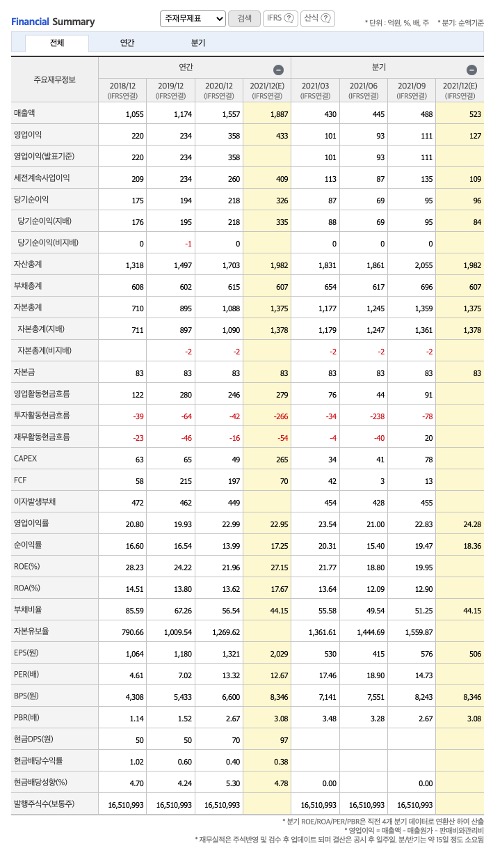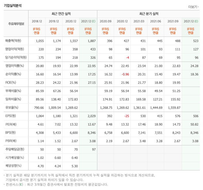 매출액 : 2018년 1055억원, 2019년 1174억원, 2020년 1557억원, 2021년 1,2,3분기 1364억원으로 전년동기대비 증가하였습니다. 2021년 3분기는 전년동기대비 20.7% 증가하였습니다. 2020년 분기별로 보면 4분기 427억원, 2021년 1분기 431억원, 2분기 445억원, 3분기 488억원입니다.