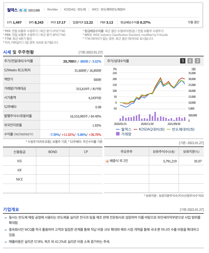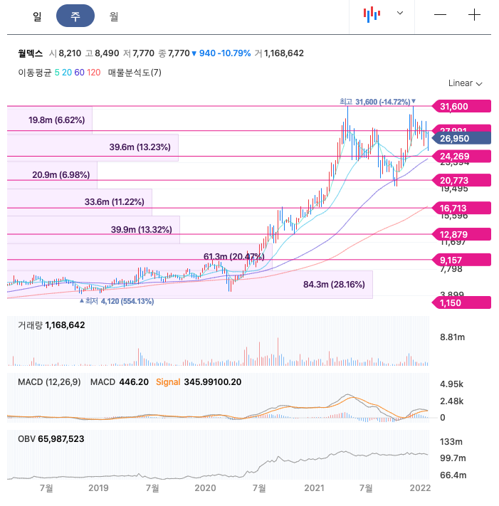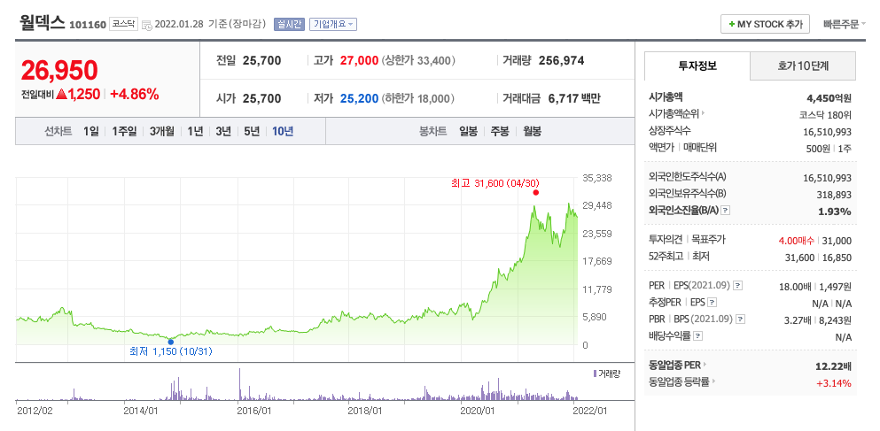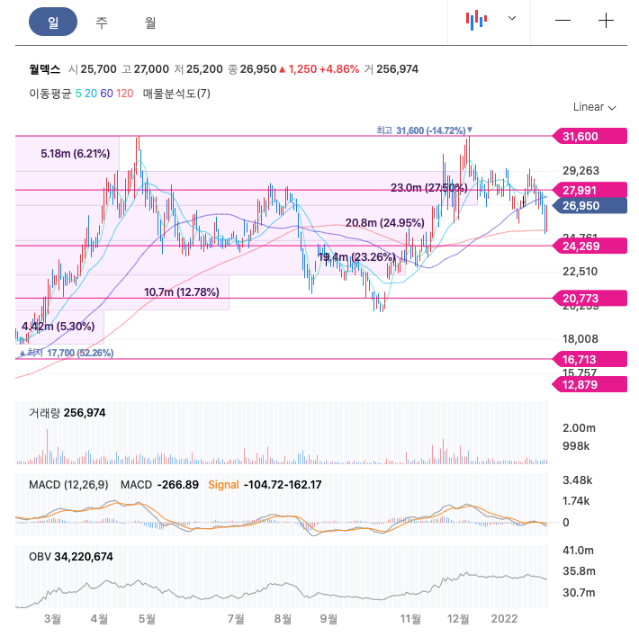 월덱스의 주가는 20년 4월부터 지속적으로 증가하다가 21년 4월 이후 조정을 받고, 21년 12월 최고 31,600월을 찍고 조정을 받았습니다.