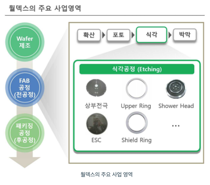 (주)월덱스는 반도체 Etching(식각) 공정 장비에 들어 가는 소모성 부품(전극, 링)을 실리콘, 쿼츠 및 Fine Ceramic 등의 소재로 제작하여 국내외 장비사 또는 소자업체들(Fab)에게 직접 납품하고 있습니다.
