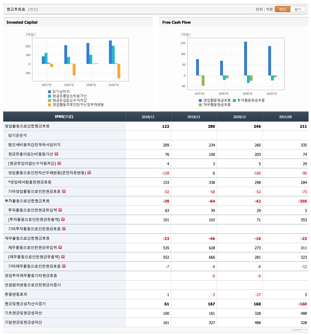 투자활동 현금흐름 : 2018년 -39억원, 2019년 -64억원, 2020년 -42억원, 2021년 1,2,3분기 -350억원으로 투자활동 현금흐름이 원활합니다.