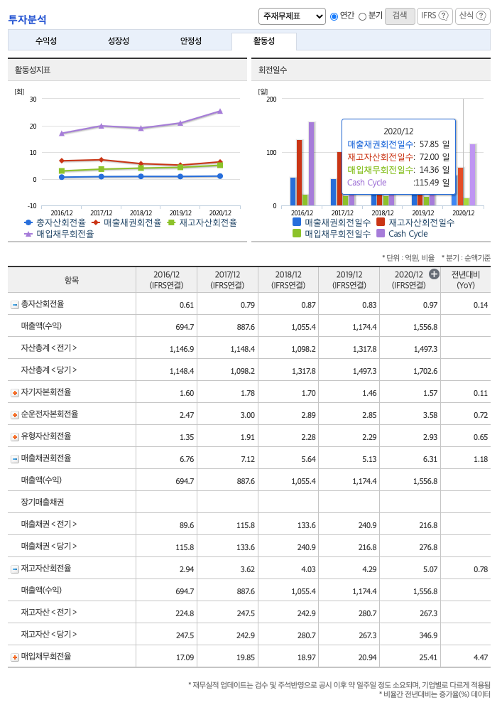 재고자산회전율(높을 수록 좋습니다) : 2018년 약 280억원, 2019년 약 267억원, 2020년 약 346억원이고, 회전율은 2018년 약 4%, 2019년 약 4%, 2020년 약 5%로 안정적입니다.