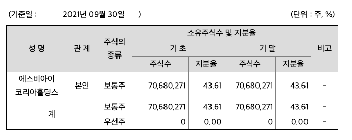 당사의 최대주주는 에스비아이코리아홀딩스(주)이며, 그 지분(율)은 70,680,271주(43.61%) 입니다.
