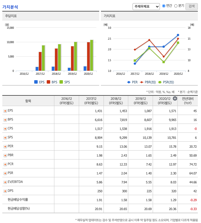DPS(Dividend Per Share의 약자, 총배당금을 총주식발생수로 나눈 것, 한 주당 얼만큼의 배당금을 받을 수 있는지 알 수 있는 지표, DPS가 높을 수록 배당금이 많은 것임) : 2017년 250원, 2018년 300원, 2019년 225원, 2020년 320원으로 전년동기보다 증가하였습니다.