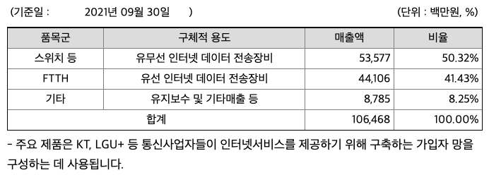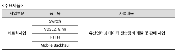 당사는 2017년 3월 1일을 분할기일로 하여 주식회사 유비쿼스홀딩스(구, 주식회사 유비쿼스)로부터 네트워크사업부문을 인적분할하여 설립되었으며, 유선 통신장비 제조업에 포함되는 인터넷 통신 네트워크 장비 전문기업입니다. 인터넷 통신은 방식에 따라서 크게 xDSL, HFC, LAN, FTTH, 위성 등으로 나눌 수 있으며, 당사의 주요 제품은 FTTH 서비스 관련 제품, LAN 서비스에 주로 쓰이는 Switch, 그리고 xDSL 관련 제품 등이며, 동 제품은 유선 전송 장치 분야 내 인터넷 통신네트워크 장비를 제조, 판매하고 있습니다.