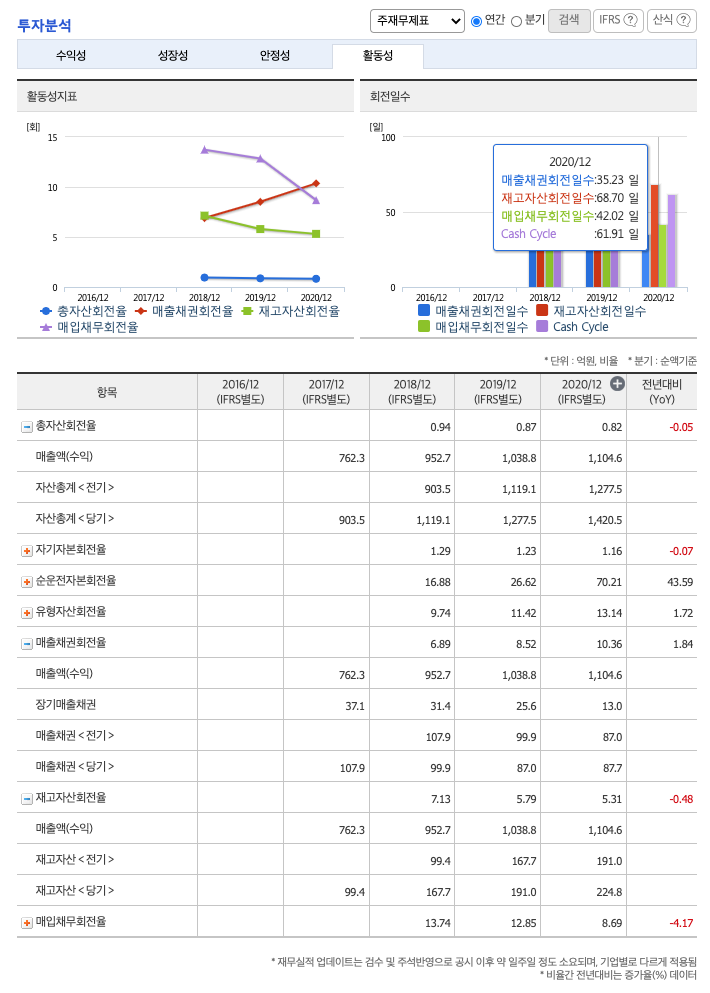 재고자산회전율(높을 수록 좋습니다) : 2018년 약 167억원, 2019년 약 191억원, 2020년 약 224억원이고, 회전율은 2018년 약 7%, 2019년 약 5%, 2020년 약 5%로 안정적입니다.