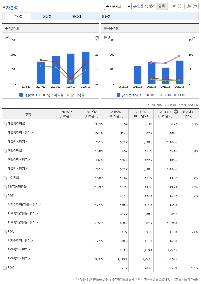ROE(Return On Equity, 자기자본순이익율, 주주의 관점) : 2018년 약 20%, 2019년 약 13%, 2020년 약 16%이고, 자기자본순이익율은 이상율(10%)보다 높습니다.