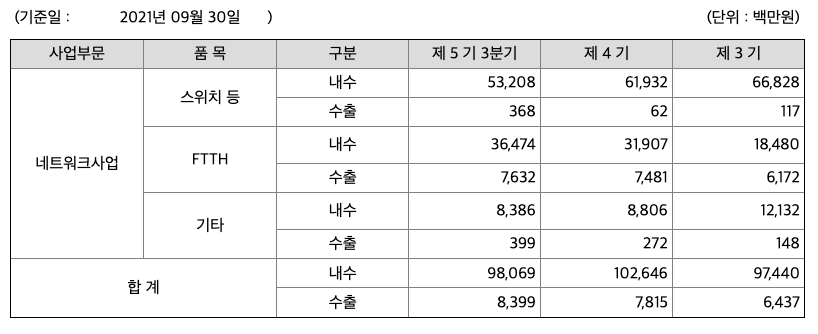 당사가 속한 인터넷 네트워크 장비 시장은 국내 초고속 인터넷 가입자 수에 큰 영향을 받고 있으며, 국내 통신사업자의 5G 무선 투자가 마무리 되는 대로 10기가 인터넷투자 증가에 따른 당사의 장비 매출 확대가 예상됩니다. 최근 국내 사업 환경이 악화된 상황에서도 당사는 경쟁력 있는 기술력을 바탕으로 시장점유율을 꾸준히 유지하였으며, Enterprise시장 및 해외사업을 재정비하여 신규 시장 확대를 준비하고 있습니다.