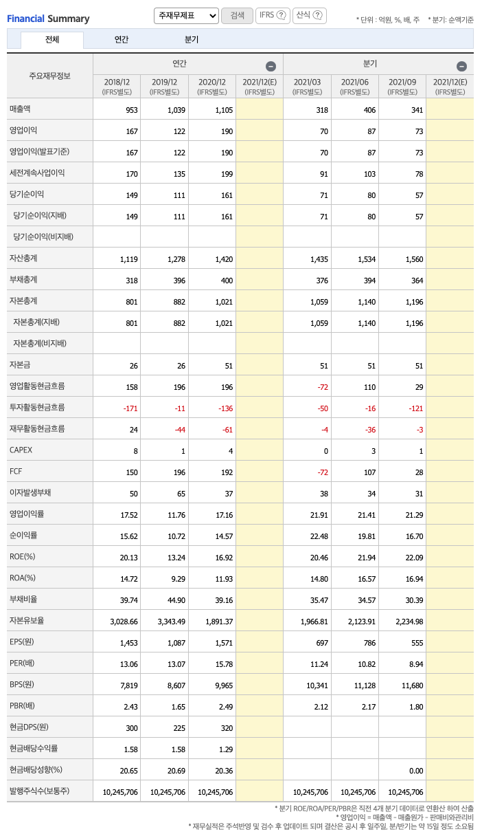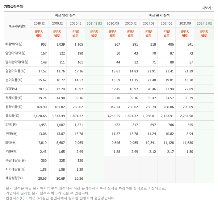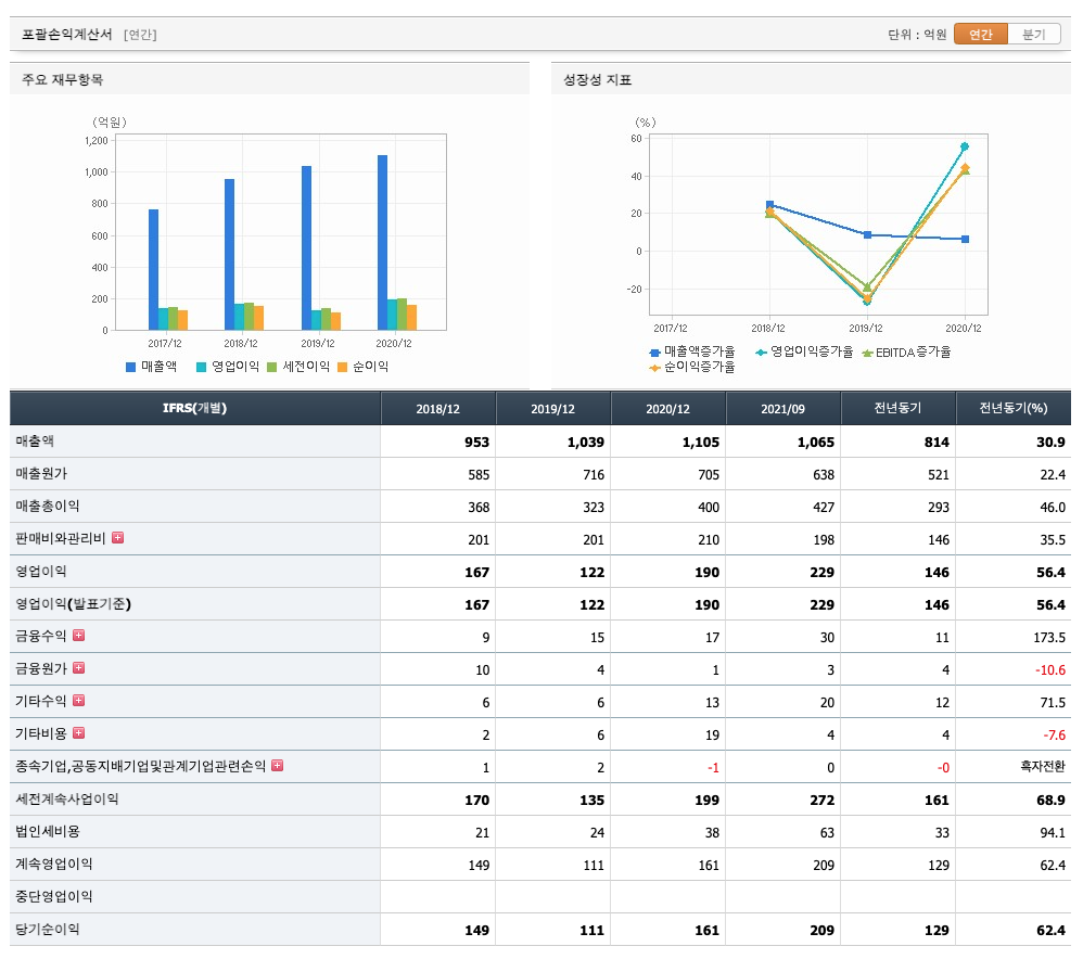 매출액 : 2018년 953억원, 2019년 1039억원, 2020년 1105억원, 2021년 1,2,3분기 1065억원으로 전년동기대비 증가하였습니다. 2021년 3분기는 전년동기대비 30.9% 증가하였습니다. 2020년 분기별로 보면 4분기 291억원, 2021년 1분기 318억원, 2분기 406억원, 3분기 341억원입니다.