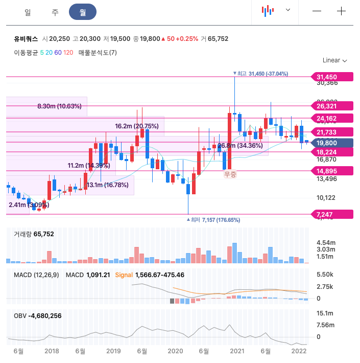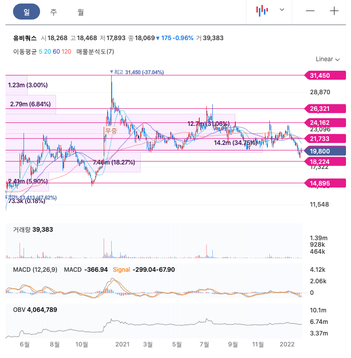 유비쿼스의 주가는 20년 11월 급증하여 최고 31,450원을 찍고 조정을 받았습니다.