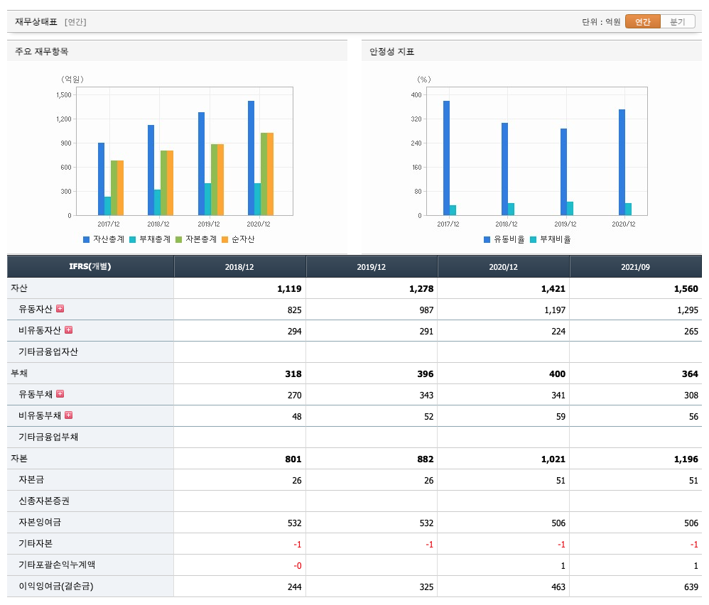 유보율 : 2018년 약 3028%, 2019년 약 3343%, 2020년 약 1891%로 감소하고 있고, 유보율이 높아 사내 유동자산이 좋습니다.