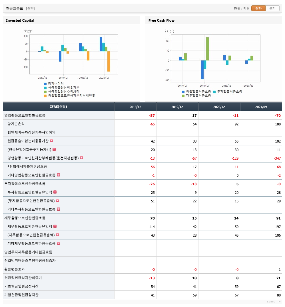 영업활동 현금흐름 : 2018년 -57억원, 2019년 17억원, 2020년 -11억원, 2021년 1,2,3분기 -70억원으로 2019년의 영업활동 현금흐름이 원활합니다.