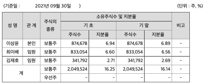 본 보고서 작성 기준일 현재 (2021년 9월 30일) 발행주식총수는 12,695,462이며, 이를 기준으로 당사의 최대주주(특수관계인 포함)는 총 2,049,524주(16.14%)를 보유하고 있으며 그 중 특수관계인 2인의 소유주식은 1,174,846주(9.25%) 입니다.