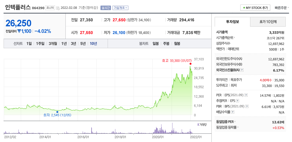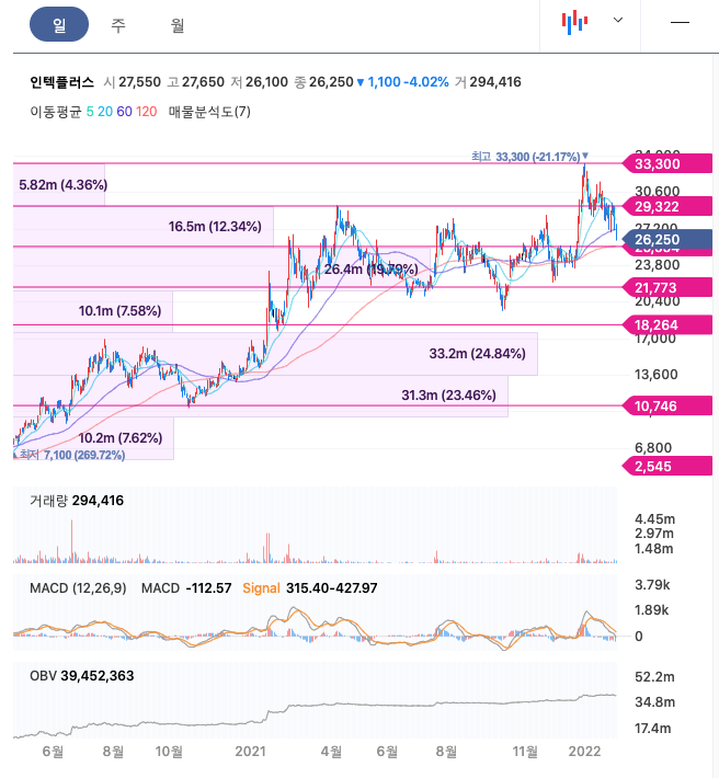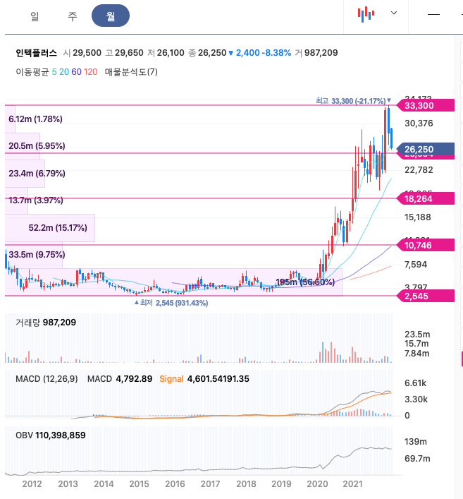 인텍플러스의 주가는 20년 10월 반등하여 21년 12월 최고 33,300원을 찍고 조정을 받았습니다.