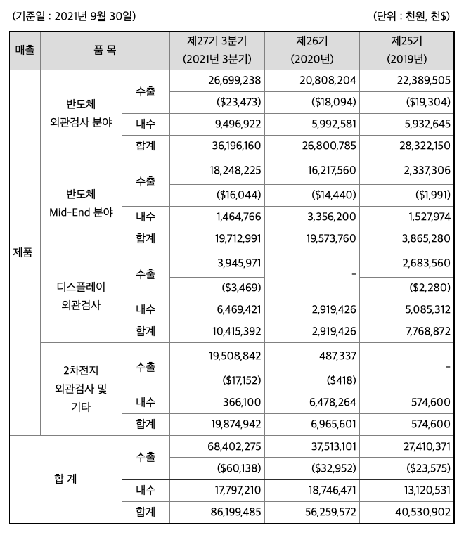 2021년은 Flexible OLED 공정의 외관검사장비 투자가 재개되었고, 외관 검사 솔루션 적용 공정 확대를 통한 제품이 다변화 되었습니다. 향후에도 Flexible OLED 공정의 Global Oled 고객사 독점적 지위를 강화해 나갈 것입니다.