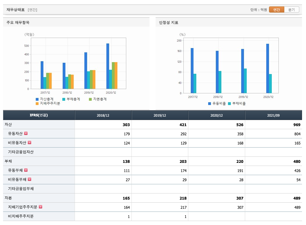 자산은 2018년 303억원, 2019년 421억원, 2020년 526억원, 2021년 1,2,3분기 969억원으로 증가 하였습니다.