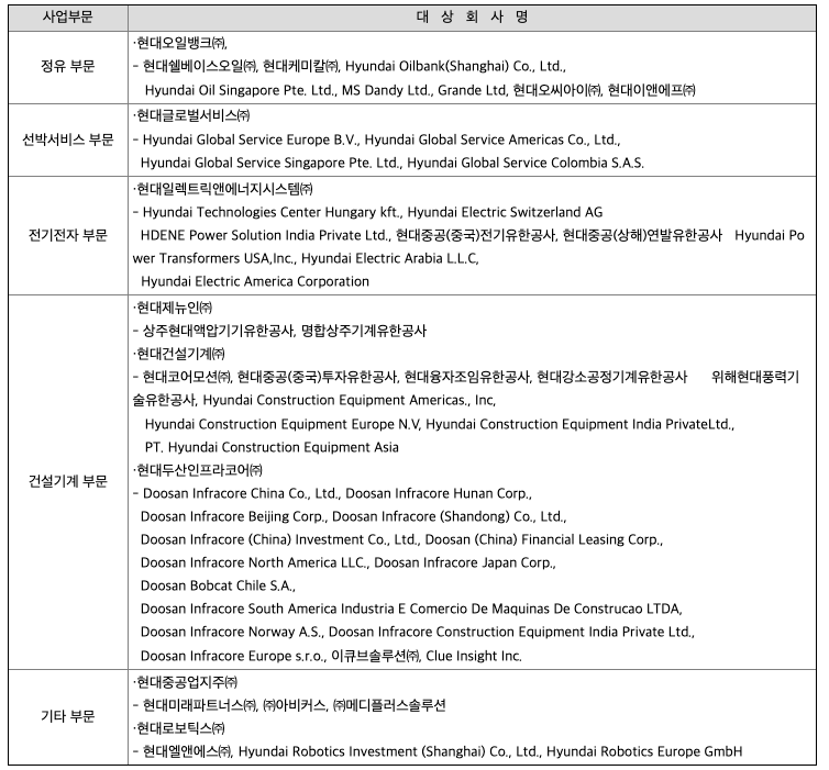 지주회사란 다른 회사의 주식소유를 목적으로 하는 회사로서 독점규제및공정거래에 관한 법률(공정거래법)에서는 자산총액이 5,000억원 이상으로 지배 목적으로 보유한 다른 회사의 지분합계가 당해 회사 자산총액의 50% 이상인 회사를 지주회사로 규정하고 있습니다. 지주회사는 크게 순수지주회사와 사업지주회사로 구분할 수 있습니다. 순수지주회사는 어떠한 사업활동도 하지 않고, 다른 회사의 주식을 소유함으로써 그 회사를 지배하는 것을주된 목적으로 하며 지배하는 자회사들로부터 받는 배당금을 주된 수입원으로 합니다. 사업지주회사는 직접 어떠한 사업활동을 함과 동시에 다른 회사를 지배하기 위하여 주식을 소유하는 회사입니다. 당사는 별도의 사업을 영위하지 않는 순수지주회사의 성격을 취하고 있으며, 선박ㆍ엔진의 A/S사업 및 정유사업, 건설기계 제조사업, 전기전자기기 제조사업, 산업용 로봇 제조업 등을 영위하는 자회사의 주식을 소유하고 있습니다. 지주회사의 장점으로는 기업경영의 투명성을 증대시켜 시장으로부터 적정한 기업가치를 평가 받음으로써 주주의 가치를 높이고, 독립적인 경영 및 객관적인 성과평가를 가능케 함으로써 책임경영을 정착시키며,사업부문별 특성에 맞는 신속하고 전문적인 의사결정이 가능한 체제를 확립하여 사업부문별 경쟁력을 강화하고, 전문화된 사업역량에 기업의 역량을 집중함으로써 경영위험의 분산 등을 추구할 수 있습니다.