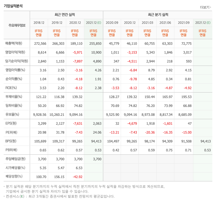 영업이익 : 2018년 8614억원, 2019년 6666억원, 2020년 -5971억원, 2021년 1,2,3분기 10,207억원으로 전년동기대비 흑자전환하였습니다. 2020년 분기별로 보면 4분기 -3,153억원, 2021년 1분기 -5,343억원, 2분기 1846억원, 3분기 3,017억원입니다.