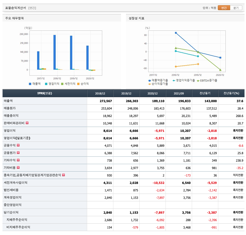 매출액 : 2018년 272,567억원, 2019년 266,303억원, 2020년 189,110억원, 2021년 1,2,3분기 196,833억원으로 전년동기대비 증가하였습니다. 2021년 3분기는 전년동기대비 37.6% 증가하였습니다. 2020년 분기별로 보면 4분기 46,110억원, 2021년 1분기 60,755억원, 2분기 63,303억원, 3분기 72,775억원입니다.